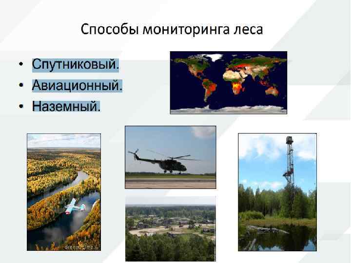 Мониторинг лесов - в РФ - система наблюдений, оценки и прогноза состояния и динамики лесного фонда в целях государственного управления в области использования, охраны, защиты лесного фонда, а также воспроизводства лесов. Лесным кодексом Российской Федерации и иными нормативными правовыми актами в сфере лесных отношений установлены четыре вида лесных мониторингов: • мониторинг пожарной опасности в лесах и лесных пожаров; • дистанционный мониторинг использования лесов; • лесопатологический мониторинг; • мониторинг радиационной обстановки в лесах.