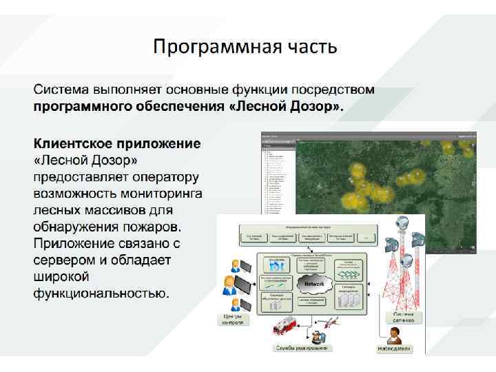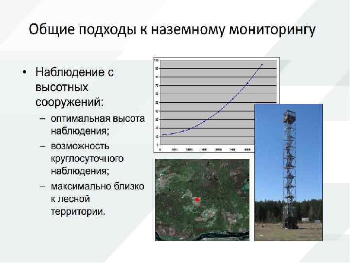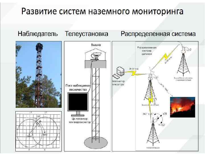 Существующие технологии мониторинга леса Наиболее традиционный метод обнаружения пожаров – это визуальное обнаружение людьми со специализированных конструкций – вышек. Настоящий метод используется более ста лет с небольшими усовершенствованиями, связанными с использованием средств связи (рации, сотовая связь и др. ) и оптическими устройствами визуального контроля (бинокли, подзорные трубы и др. ). В идеальном варианте обнаружение пожара происходит следующим образом: на специализированной вышке (предназначенной для продолжительного нахождения на ней человека) на специальной площадке находится человек.