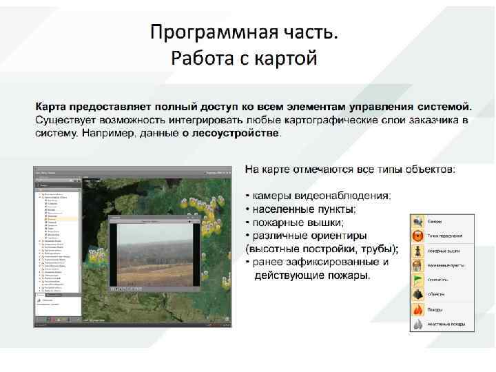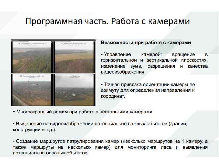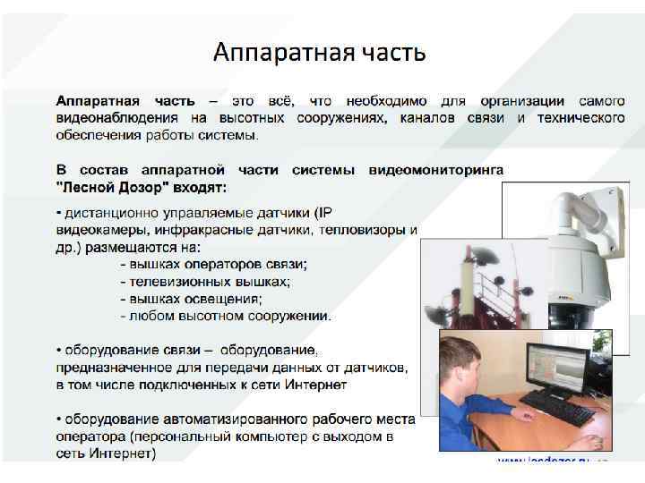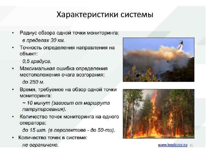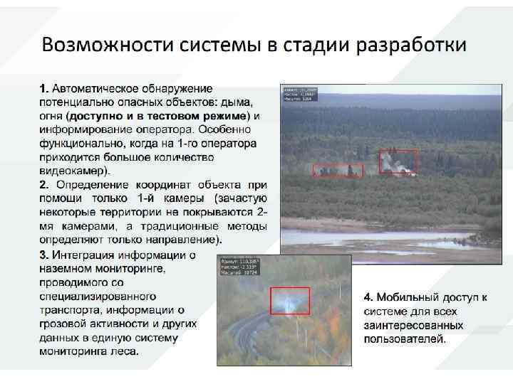 Но при всех недостатках спутниковый мониторинг необходим в случае больших лесных территорий и отсутствии возможности мониторинга другими способами (стоимость спутникового мониторинга также невысока) В последние несколько лет начинают появляться системы видеомониторинга предназначенные для обнаружения лесных пожаров, первые системы в России появились в начале 2000 -х годов. Основной особенностью видеосистемы мониторинга является высокая степень автоматизации и возможность использовать дешевые и простые вышки. Существующие системы представляют собой поворотные камеры, устанавливаемые на вышках с выводом видеоизображения на пульт оператору, который должен находиться рядом с постом