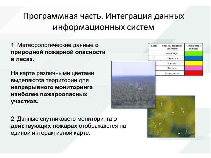 Например, мониторинг пожарной опасности в лесах и лесных пожаров проводится на территории всех лесов Российской Федерации, дистанционный мониторинг – 120 миллионов гектар ежегодный объем. Регулярные наземные наблюдения в рамках лесопатологического мониторинга – 109 миллионов гектар. Дистанционный мониторинг в рамках лесопатологического мониторинга – 25 миллионов гектар. При проведении лесных мониторингов с учетом значительных объемов работ широко используется космическая информация с различным пространственным разрешением снимков.