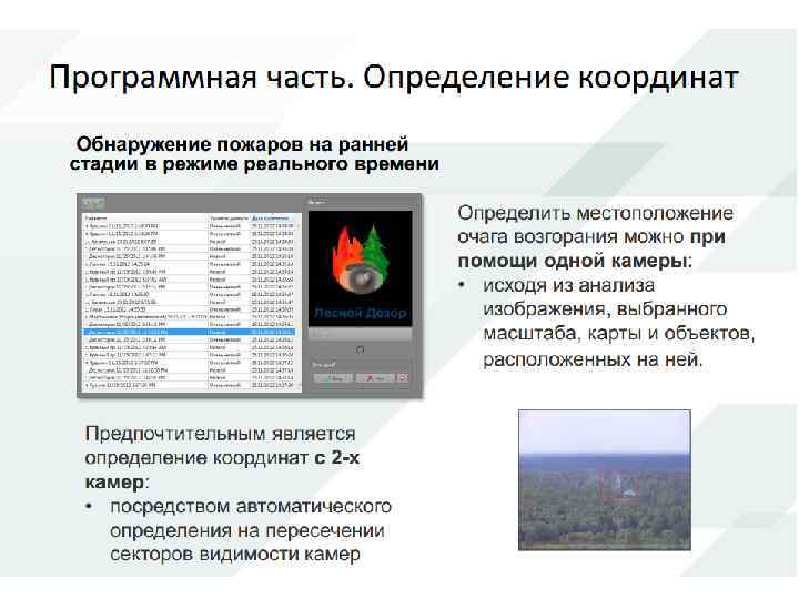 Существенными недостатками используемых в настоящее время методов обнаружения является невозможность раннего обнаружения, автоматизации процесса обнаружения и определения местоположения очага возгорания. Группой, представляющей настоящий проект, был предложен метод обнаружения пожаров с помощью программно аппаратного комплекса основанного на видеонаблюдении. Кроме того, было предложена концепция информационной платформы системы облегчающей управление процессом пожаротушения.