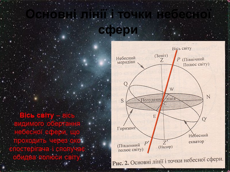 Основні лінії і точки небесної сфери Вісь світу – вісь видимого обертання небесної сфери, що проходить через око спостерігача і сполучає обидва полюси світу.