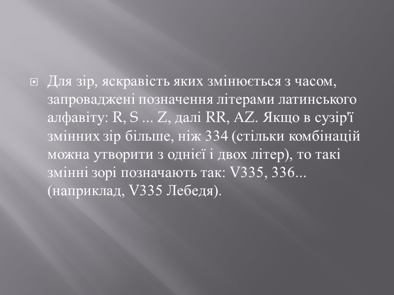 Для зір, яскравість яких змінюється з часом, запроваджені позначення літерами латинського алфавіту: R, S ... Z, далі RR, АZ. Якщо в сузір'ї змінних зір більше, ніж 334 (стільки комбінацій можна утворити з однієї і двох літер), то такі змінні зорі позначають так: V335, 336... (наприклад, V335 Лебедя).