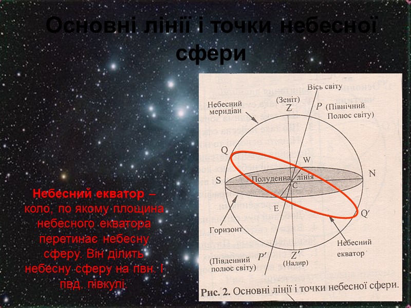 Основні лінії і точки небесної сфери Небесний екватор – коло, по якому площина небесного екватора перетинає небесну сферу. Він ділить небесну сферу на пвн. І пвд. півкулі.