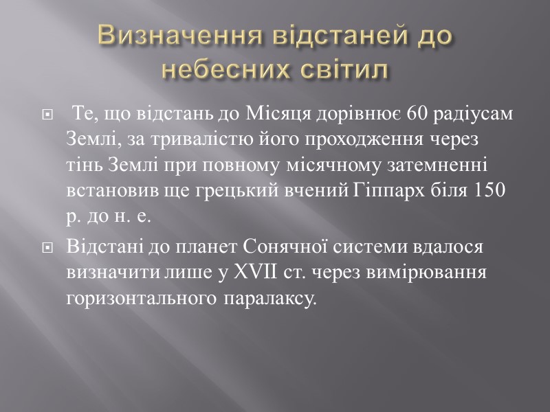 Визначення відстаней до небесних світил Те, що відстань до Місяця дорівнює 60 радіусам Землі, за тривалістю його проходження через тінь Землі при повному місячному затемненні встановив ще грецький вчений Гіппарх біля 150 р. до н. е. Відстані до планет Сонячної системи вдалося визначити лише у XVII ст. через вимірювання горизонтального паралаксу.