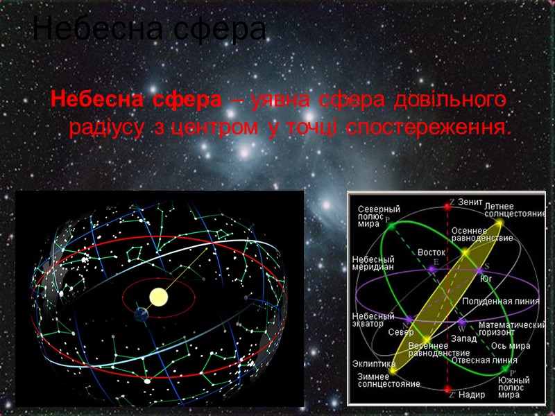 Небесна сфера Небесна сфера – уявна сфера довільного радіусу з центром у точці спостереження.