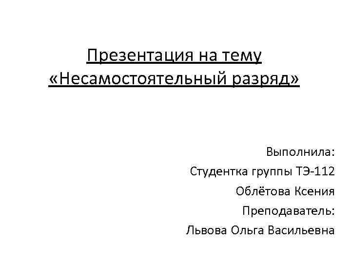Презентация на тему «Несамостоятельный разряд» Выполнила: Студентка группы ТЭ-112 Облётова Ксения Преподаватель: Львова Ольга Васильевна