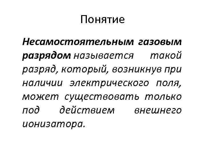 Понятие Несамостоятельным газовым разрядом называется такой разряд, который, возникнув при наличии электрического поля, может существовать только под действием внешнего ионизатора.