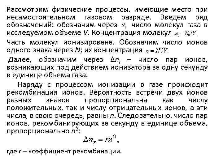 Рассмотрим физические процессы, имеющие место при несамостоятельном газовом разряде. Введем ряд обозначений: обозначим через число молекул газа в исследуемом объеме V. Концентрация молекул Часть молекул ионизирована. Обозначим число ионов одного знака через N; их концентрация Далее, обозначим через ∆ni – число пар ионов, возникающих под действием ионизатора за одну секунду в единице объема газа. Наряду с процессом ионизации в газе происходит рекомбинация ионов. Вероятность встречи двух ионов разных знаков пропорциональна как числу положительных, так и числу отрицательных ионов, а эти числа, в свою очередь, равны n. Следовательно, число пар ионов, рекомбинирующих за секунду в единице объема, пропорционально n 2: где r – коэффициент рекомбинации.