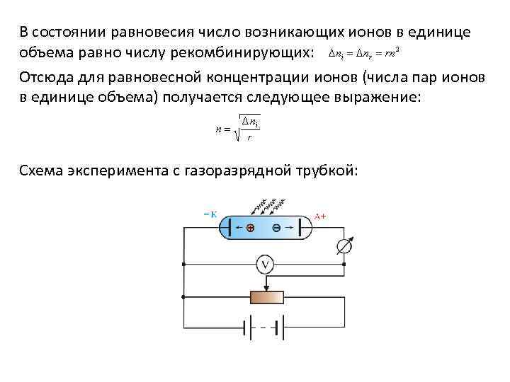 В состоянии равновесия число возникающих ионов в единице объема равно числу рекомбинирующих: Отсюда для равновесной концентрации ионов (числа пар ионов в единице объема) получается следующее выражение: Схема эксперимента с газоразрядной трубкой: