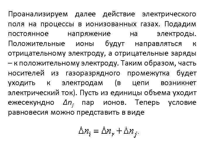 Проанализируем далее действие электрического поля на процессы в ионизованных газах. Подадим постоянное напряжение на электроды. Положительные ионы будут направляться к отрицательному электроду, а отрицательные заряды – к положительному электроду. Таким образом, часть носителей из газоразрядного промежутка будет уходить к электродам (в цепи возникнет электрический ток). Пусть из единицы объема уходит ежесекундно ∆nj пар ионов. Теперь условие равновесия можно представить в виде