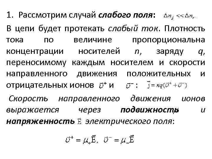 1. Рассмотрим случай слабого поля: В цепи будет протекать слабый ток. Плотность тока по величине пропорциональна концентрации носителей n, заряду q, переносимому каждым носителем и скорости направленного движения положительных и отрицательных ионов и : Скорость направленного движения ионов выражается через подвижность и напряженность электрического поля: