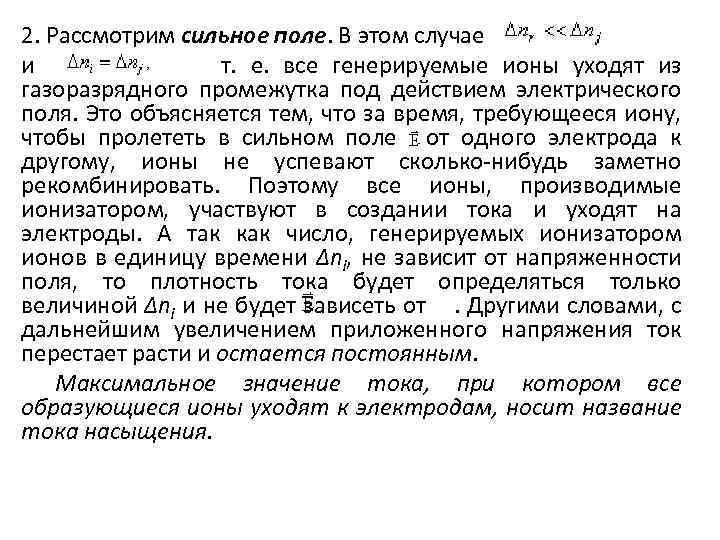 2. Рассмотрим сильное поле. В этом случае и т. е. все генерируемые ионы уходят из газоразрядного промежутка под действием электрического поля. Это объясняется тем, что за время, требующееся иону, чтобы пролететь в сильном поле от одного электрода к другому, ионы не успевают сколько-нибудь заметно рекомбинировать. Поэтому все ионы, производимые ионизатором, участвуют в создании тока и уходят на электроды. А так как число, генерируемых ионизатором ионов в единицу времени ∆ni, не зависит от напряженности поля, то плотность тока будет определяться только величиной ∆ni и не будет зависеть от . Другими словами, с дальнейшим увеличением приложенного напряжения ток перестает расти и остается постоянным. Максимальное значение тока, при котором все образующиеся ионы уходят к электродам, носит название тока насыщения.