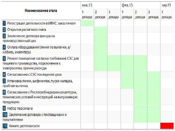 • Каналы реализации продукции • Основной канал сбыта: небольшие розничные магазины, расположенные в г. «N» и близлежащих населенных пунктах. Реализация через сетевые (региональные и федеральные) продуктовые магазины в 2013 г. не планируется. • План реализации проекта • Календарный план • Согласно календарного плана, срок запуска компании составляет 2 месяца. Все этапы, связанные с открытием деятельности находятся в зоне ответственности собственника бизнеса.