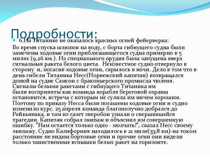 Подробности: 6. На Титанике не оказалось красных огней фейерверка: Во время спуска шлюпок на воду, с борта гибнущего судна были замечены ходовые огни приближающегося судна примерно в 5 милях (9, 26 км. ). Из специального орудия была запущена вверх сигнальная ракета белого цвета. Неизвестное судно отвернуло в сторону и, погасив ходовые огни, скрылось в ночи. Дело в том что в день гибели Титаника Несс(Норвежский капитан) возвращался домой на судне Самсон с браконьерского промысла тюленя. Сигналы белыми ракетами с гибнущего Титаника им были восприняты как команда корабля береговой охраны остановится, встреча с которым не сулила им ничем хорошим. Поэтому по приказу Несса были погашены ходовые огни и судно изменило курс. 25 апреля команда благополучно добрался до Рейкьявика, и там из газет зверобои узнали о свершившейся трагедии. Капитан собрал экипаж и объяснил им совершенную ошибку. "Нам остается только одно - молчать!", сказал Несс своему экипажу. Судно Калифорния находилось в 21 миле(33, 8 км)-на током расстояние не видны бортовые огни и прочие огни они видели только таинственные вспышки белых ракет на горизонте.