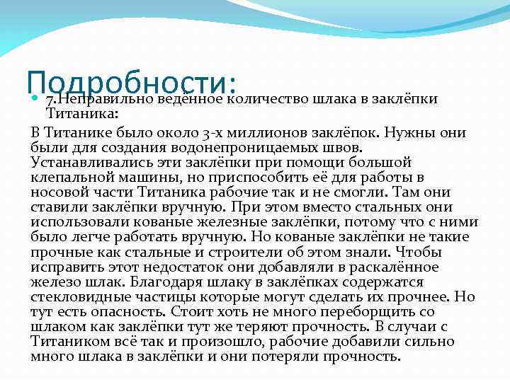 Подробности: 7. Неправильно ведённое количество шлака в заклёпки Титаника: В Титанике было около 3 -х миллионов заклёпок. Нужны они были для создания водонепроницаемых швов. Устанавливались эти заклёпки при помощи большой клепальной машины, но приспособить её для работы в носовой части Титаника рабочие так и не смогли. Там они ставили заклёпки вручную. При этом вместо стальных они использовали кованые железные заклёпки, потому что с ними было легче работать вручную. Но кованые заклёпки не такие прочные как стальные и строители об этом знали. Чтобы исправить этот недостаток они добавляли в раскалённое железо шлак. Благодаря шлаку в заклёпках содержатся стекловидные частицы которые могут сделать их прочнее. Но тут есть опасность. Стоит хоть не много переборщить со шлаком как заклёпки тут же теряют прочность. В случаи с Титаником всё так и произошло, рабочие добавили сильно много шлака в заклёпки и они потеряли прочность.