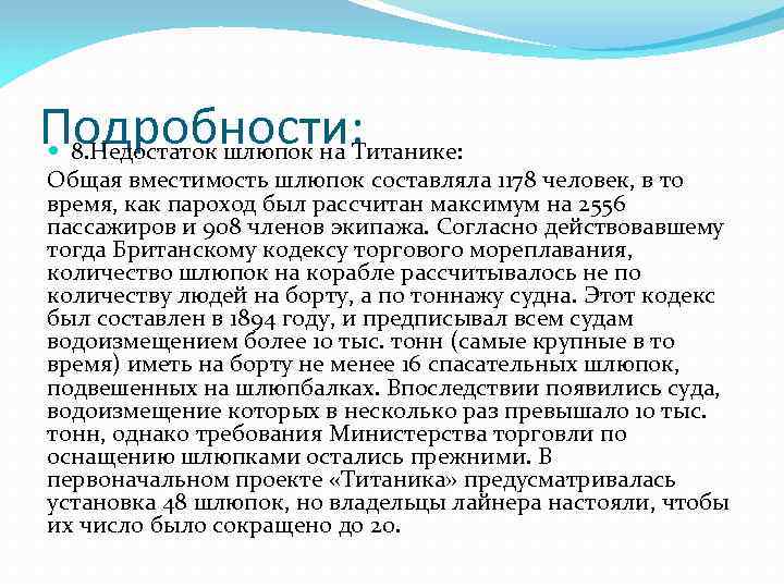 Подробности: 8. Недостаток шлюпок на Титанике: Общая вместимость шлюпок составляла 1178 человек, в то время, как пароход был рассчитан максимум на 2556 пассажиров и 908 членов экипажа. Согласно действовавшему тогда Британскому кодексу торгового мореплавания, количество шлюпок на корабле рассчитывалось не по количеству людей на борту, а по тоннажу судна. Этот кодекс был составлен в 1894 году, и предписывал всем судам водоизмещением более 10 тыс. тонн (самые крупные в то время) иметь на борту не менее 16 спасательных шлюпок, подвешенных на шлюпбалках. Впоследствии появились суда, водоизмещение которых в несколько раз превышало 10 тыс. тонн, однако требования Министерства торговли по оснащению шлюпками остались прежними. В первоначальном проекте «Титаника» предусматривалась установка 48 шлюпок, но владельцы лайнера настояли, чтобы их число было сокращено до 20.
