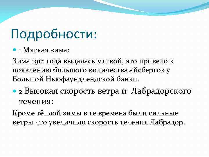 Подробности: 1 Мягкая зима: Зима 1912 года выдалась мягкой, это привело к появлению большого количества айсбергов у Большой Ньюфаундлендской банки. 2 Высокая скорость ветра и Лабрадорского течения: Кроме тёплой зимы в те времена были сильные ветры что увеличило скорость течения Лабрадор.