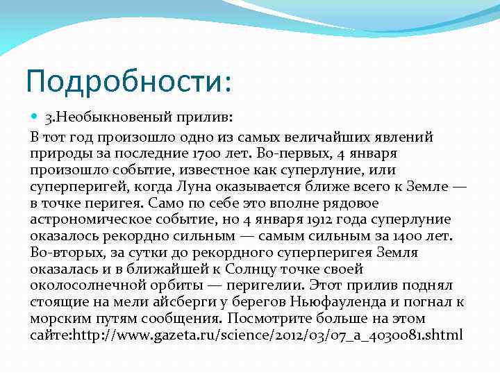 Подробности: 3. Необыкновеный прилив: В тот год произошло одно из самых величайших явлений природы за последние 1700 лет. Во-первых, 4 января произошло событие, известное как суперлуние, или суперперигей, когда Луна оказывается ближе всего к Земле — в точке перигея. Само по себе это вполне рядовое астрономическое событие, но 4 января 1912 года суперлуние оказалось рекордно сильным — самым сильным за 1400 лет. Во-вторых, за сутки до рекордного суперперигея Земля оказалась и в ближайшей к Солнцу точке своей околосолнечной орбиты — перигелии. Этот прилив поднял стоящие на мели айсберги у берегов Ньюфауленда и погнал к морским путям сообщения. Посмотрите больше на этом сайте: http: //www. gazeta. ru/science/2012/03/07_a_4030081. shtml