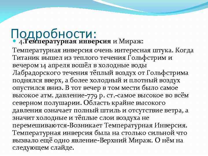 Подробности: и Мираж: 4. Температурная инверсия очень интересная штука. Когда Титаник вышел из теплого течения Гольфстрим и вечером 14 апреля вошёл в холодные воды Лабрадорского течения тёплый воздух от Гольфстрима поднялся вверх, а более холодный и плотный воздух опустился вниз. В тот вечер в том мести было самое высокое атм. давление-779 р. ст. -самое высокое во всём северном полушарии. Область крайне высокого давления означает полный штиль и отсутствие ветра, а значит холодные и тёплые слои воздуха не перемешиваются-Возникает Температурная Инверсия. Температурная инверсия была на столько сильной что вызвало ещё одно явление-Верхний Мираж. О нём на следующем слайде.