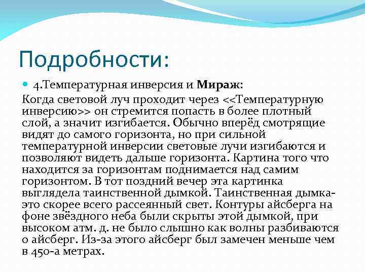 Подробности: 4. Температурная инверсия и Мираж: Когда световой луч проходит через <<Температурную инверсию>> он стремится попасть в более плотный слой, а значит изгибается. Обычно вперёд смотрящие видят до самого горизонта, но при сильной температурной инверсии световые лучи изгибаются и позволяют видеть дальше горизонта. Картина того что находится за горизонтам поднимается над самим горизонтом. В тот поздний вечер эта картинка выглядела таинственной дымкой. Таинственная дымкаэто скорее всего рассеянный свет. Контуры айсберга на фоне звёздного неба были скрыты этой дымкой, при высоком атм. д. не было слышно как волны разбиваются о айсберг. Из-за этого айсберг был замечен меньше чем в 450 -а метрах.