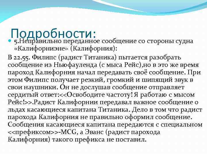 Подробности: 5. Неправильно переданное сообщение со стороны судна «Калифорниэне» (Калифорния): В 22. 55. Филипс (радист Титаника) пытается разобрать сообщение из Ньюфауленда (с мыса Рейс), но в это же время пароход Калифорния начал передавать своё сообщение. При этом Филипс получает резкий, громкий и шипящий звук в свои наушники. Он не дослушав сообщение отправляет сердитый ответ: <<Освободите частоту! Я работаю с мысом Рейс!>>. Радист Калифорнии передавал важное сообщение о льдах касающиеся капитана Титаника. Дело в том что радист парохода Калифорния не правильно оформил сообщение. Сообщения касающиеся капитана передаются с специальном <<префиксом>>-MCG, а Эванс (радист парохода Калифорния) такого префикса не поставил.