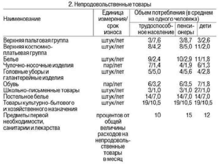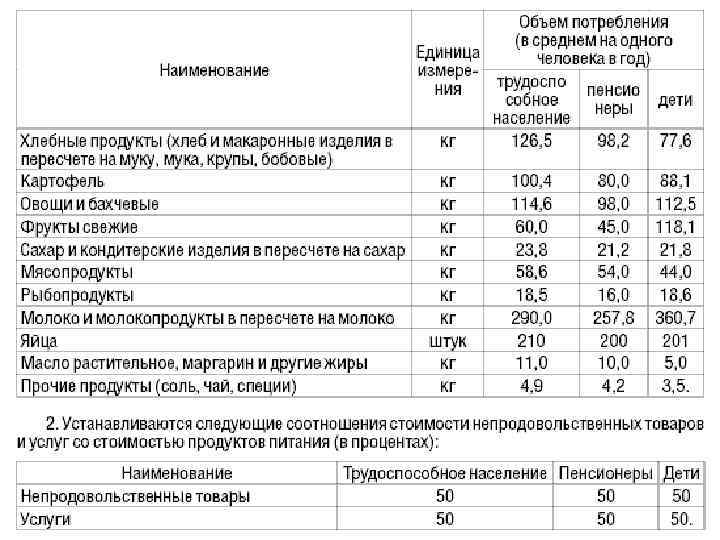 Потребительская корзина для основных социально -демографических групп населения (трудоспособное население, пенсионеры, дети) в целом по Российской Федерации определяется не реже одного раза в пять лет и устанавливается в следующих составе и объемах (в натуральных показателях):