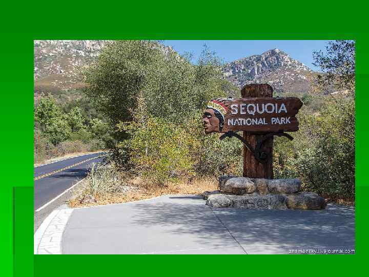 Расположение и площадь § Национальный парк Секвойя (англ. Sequoia National Park) — национальный парк США, расположен в южной части Сьерры-Невады, к востоку от города Висалия (англ. Visalia) в Калифорнии. Площадь парка 1 635 км².