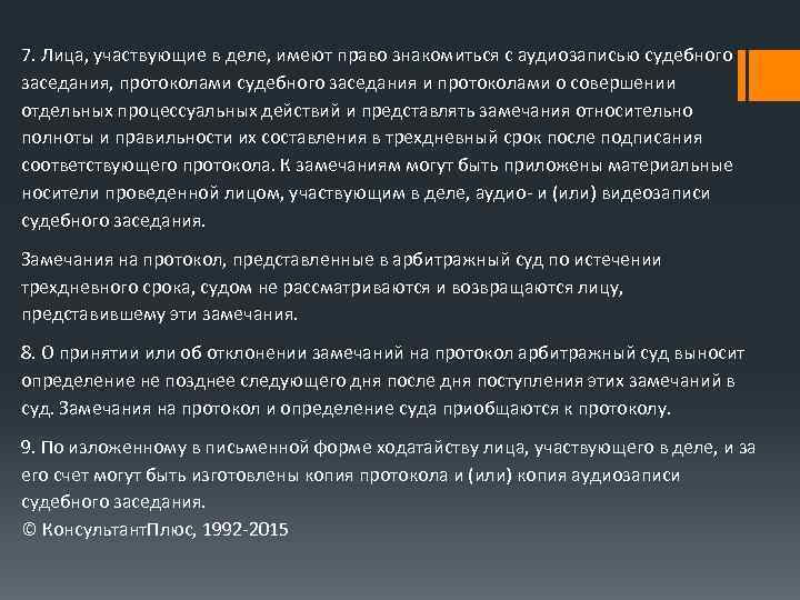 7. Лица, участвующие в деле, имеют право знакомиться с аудиозаписью судебного заседания, протоколами судебного заседания и протоколами о совершении отдельных процессуальных действий и представлять замечания относительно полноты и правильности их составления в трехдневный срок после подписания соответствующего протокола. К замечаниям могут быть приложены материальные носители проведенной лицом, участвующим в деле, аудио- и (или) видеозаписи судебного заседания. Замечания на протокол, представленные в арбитражный суд по истечении трехдневного срока, судом не рассматриваются и возвращаются лицу, представившему эти замечания. 8. О принятии или об отклонении замечаний на протокол арбитражный суд выносит определение не позднее следующего дня после дня поступления этих замечаний в суд. Замечания на протокол и определение суда приобщаются к протоколу. 9. По изложенному в письменной форме ходатайству лица, участвующего в деле, и за его счет могут быть изготовлены копия протокола и (или) копия аудиозаписи судебного заседания. © Консультант. Плюс, 1992 -2015