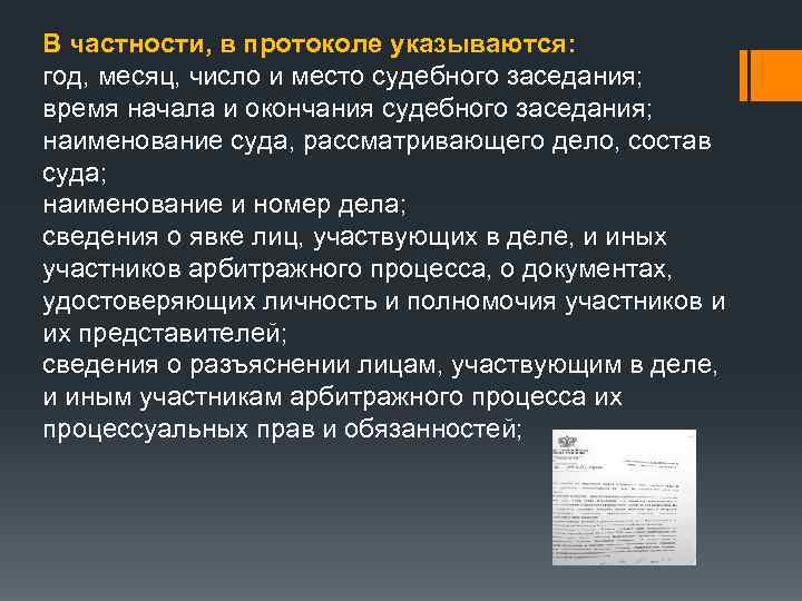 В частности, в протоколе указываются: год, месяц, число и место судебного заседания; время начала и окончания судебного заседания; наименование суда, рассматривающего дело, состав суда; наименование и номер дела; сведения о явке лиц, участвующих в деле, и иных участников арбитражного процесса, о документах, удостоверяющих личность и полномочия участников и их представителей; сведения о разъяснении лицам, участвующим в деле, и иным участникам арбитражного процесса их процессуальных прав и обязанностей;