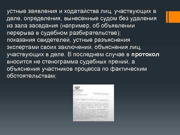 устные заявления и ходатайства лиц, участвующих в деле, определения, вынесенные судом без удаления из зала заседания (например, об объявлении перерыва в судебном разбирательстве); показания свидетелей, устные разъяснения экспертами своих заключений, объяснения лиц, участвующих в деле. В последнем случае в протокол вносится не стенограмма судебных прений, а объяснения участников процесса по фактическим обстоятельствам;