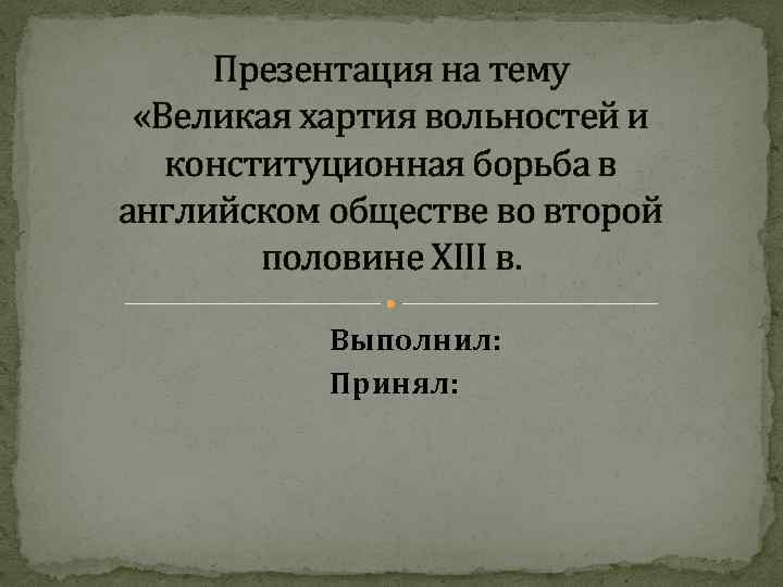 Презентация на тему «Великая хартия вольностей и конституционная борьба в английском обществе во второй половине XIII в. Выполнил: Принял: