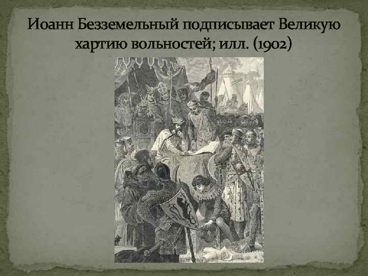 Иоанн Безземельный подписывает Великую хартию вольностей; илл. (1902)