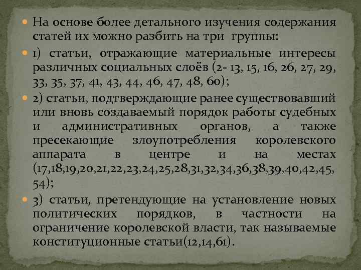 На основе более детального изучения содержания статей их можно разбить на три группы: 1) статьи, отражающие материальные интересы различных социальных слоёв (2 - 13, 15, 16, 27, 29, 33, 35, 37, 41, 43, 44, 46, 47, 48, 60); 2) статьи, подтверждающие ранее существовавший или вновь создаваемый порядок работы судебных и административных органов, а также пресекающие злоупотребления королевского аппарата в центре и на местах (17, 18, 19, 20, 21, 22, 23, 24, 25, 28, 31, 32, 34, 36, 38, 39, 40, 42, 45, 54); 3) статьи, претендующие на установление новых политических порядков, в частности на ограничение королевской власти, так называемые конституционные статьи(12, 14, 61).