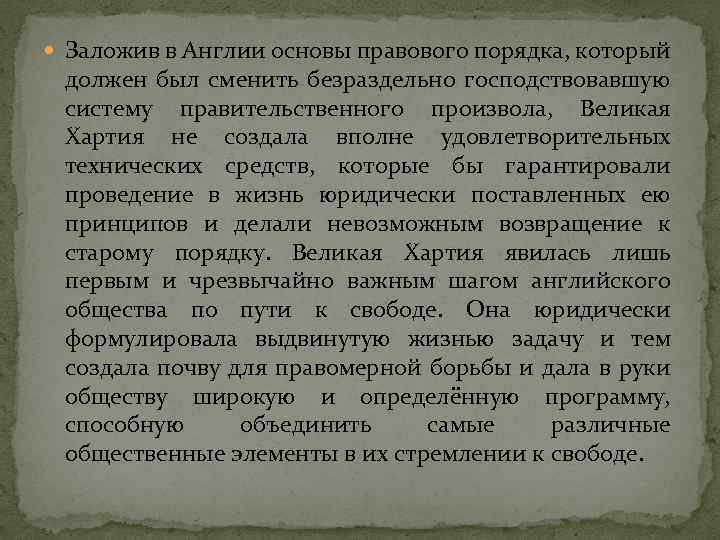 Заложив в Англии основы правового порядка, который должен был сменить безраздельно господствовавшую систему правительственного произвола, Великая Хартия не создала вполне удовлетворительных технических средств, которые бы гарантировали проведение в жизнь юридически поставленных ею принципов и делали невозможным возвращение к старому порядку. Великая Хартия явилась лишь первым и чрезвычайно важным шагом английского общества по пути к свободе. Она юридически формулировала выдвинутую жизнью задачу и тем создала почву для правомерной борьбы и дала в руки обществу широкую и определённую программу, способную объединить самые различные общественные элементы в их стремлении к свободе.