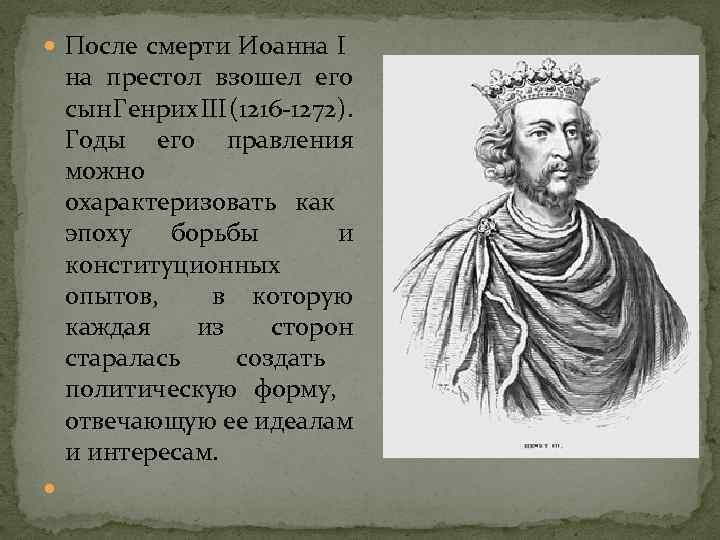 После смерти Иоанна I на престол взошел его сын Генрих III (1216 -1272). Годы его правления можно охарактеризовать как эпоху борьбы и конституционных опытов, в которую каждая из сторон старалась создать политическую форму, отвечающую ее идеалам и интересам.