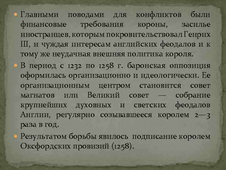 Главными поводами для конфликтов были финансовые требования короны, засилье иностранцев, которым покровительствовал Генрих III, и чуждая интересам английских феодалов и к тому же неудачная внешняя политика короля. В период с 1232 по 1258 г. баронская оппозиция оформилась организационно и идеологически. Ее организационным центром становится совет магнатов или Великий совет — собрание крупнейших духовных и светских феодалов Англии, регулярно созывавшееся королем 2— 3 раза в год. Результатом борьбы явилось подписание королем Оксфордских провизий (1258).