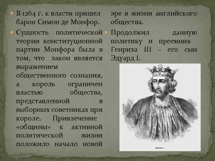 В 1264 г. к власти пришел барон Симон де Монфор. Сущность политической теории конституционной партии Монфора была в том, что закон является выражением общественного сознания, а король ограничен властью общества, представленной в выборных советниках при короле. Привлечение «общины» к активной политической жизни положило начало новой эре в жизни английского общества. Продолжил данную политику и преемник Генриха III – его сын Эдуард I.