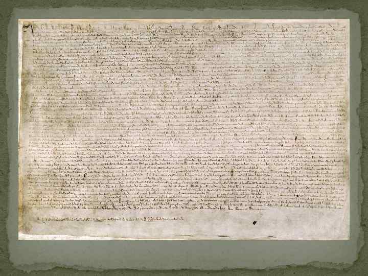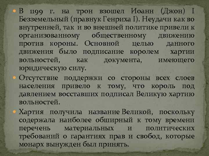 В 1199 г. на трон взошел Иоанн (Джон) I Безземельный (правнук Генриха I). Неудачи как во внутренней, так и во внешней политике привели к организованному общественному движению против короны. Основной целью данного движения было подписание королем хартии вольностей, как документа, имеющего юридическую силу. Отсутствие поддержки со стороны всех слоев населения привело к тому, что король под давлением восставших подписал Великую хартию вольностей. Хартия получила название Великой, поскольку содержала наиболее обширный к тому времени перечень материальных и политических требований о гарантиях прав и свобод, которые монарх вынужден был принять.