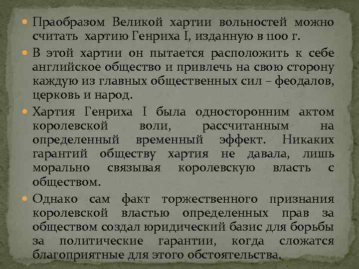 Праобразом Великой хартии вольностей можно считать хартию Генриха I, изданную в 1100 г. В этой хартии он пытается расположить к себе английское общество и привлечь на свою сторону каждую из главных общественных сил – феодалов, церковь и народ. Хартия Генриха I была односторонним актом королевской воли, рассчитанным на определенный временный эффект. Никаких гарантий обществу хартия не давала, лишь морально связывая королевскую власть с обществом. Однако сам факт торжественного признания королевской властью определенных прав за обществом создал юридический базис для борьбы за политические гарантии, когда сложатся благоприятные для этого обстоятельства.
