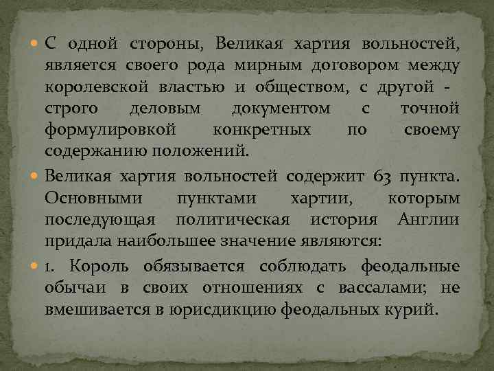 С одной стороны, Великая хартия вольностей, является своего рода мирным договором между королевской властью и обществом, с другой - строго деловым документом с точной формулировкой конкретных по своему содержанию положений. Великая хартия вольностей содержит 63 пункта. Основными пунктами хартии, которым последующая политическая история Англии придала наибольшее значение являются: 1. Король обязывается соблюдать феодальные обычаи в своих отношениях с вассалами; не вмешивается в юрисдикцию феодальных курий.