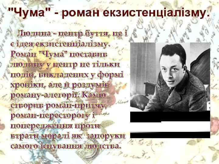 "Чума" - роман екзистенціалізму. Людина - центр буття, це і є ідея екзистенціалізму. Роман "Чума" поставив людину у центр не тільки подій, викладених у формі хроніки, але й роздумів роману-алегорії. Камю створив роман-притчу, роман-пересторогу і попередження проти втрати моралі як запоруки самого існування людства.