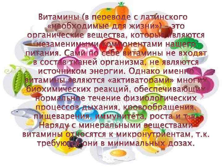Классификация Все витамины подразделяют на жиро- и водорастворимые. К первым относят витамины А, Д, Е, К. Водорастворимыми являются витамины группы В: В 1, В 2, В 5 (пантотеновая кислота), В 6, В 12, ВС (фолиевая кислота), витамины С, Н (биотин), РР (никотиновая кислота). Несколько из этих витаминов (В 1, В 2 , В 6, В 5 , фолиевая кислота, витамин К) синтезируются нормальной микрофлорой (бактериями) кишечника, однако в очень малом количестве, значительно уступающем суточной потребности человеческого организма.