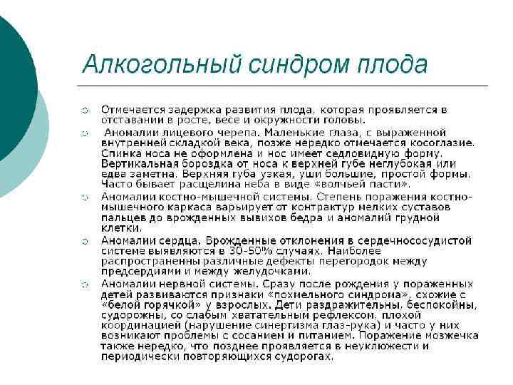 Влияние алкоголя на плод В 1967 году французский врач Лемье и его команда впервые научно описали детей, пораженных злоупотреблением алкоголя беременными. Были отмечены аномалии роста и развития как во внутриутробном периоде, так и после рождения: необычные очертания лица, врожденные уродства, такие как пороки сердца, не заращение неба и другие, сочетающиеся с психическими отклонениями.