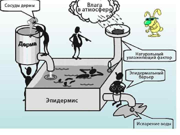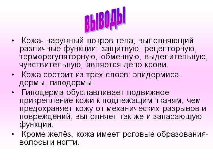 Через всю дерму проходит множество кровеносных сосудов, лимфатических сосудов, капилляров, чувствительных нервных окончаний, волосяных фолликулов, потовых желез и их протоков, гладких мышечных волокон. Функции дермы: Дерму можно сравнить с каркасом, который обеспечивает механические свойства кожи ее упругость, растяжимость и прочность.