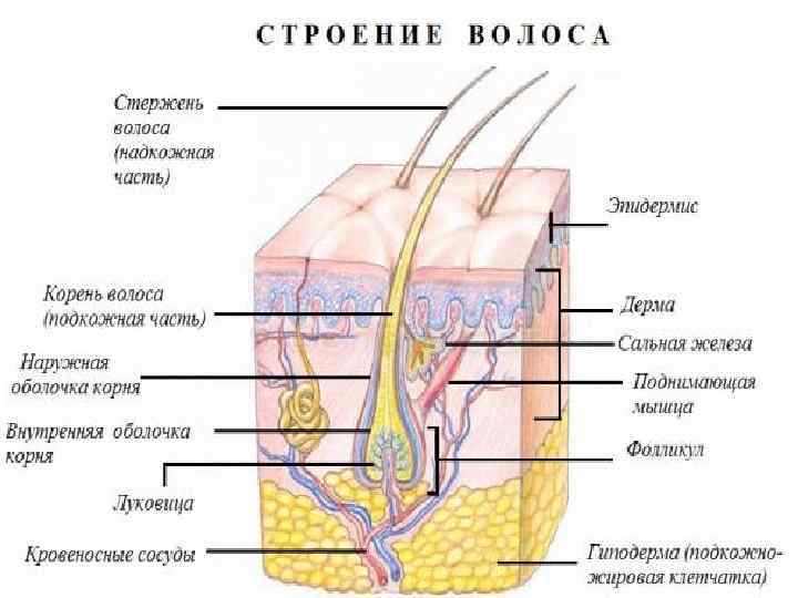 Сердцевина волоса (мозговой, или мякотный слой) состоит из не полностью ороговевших сплющенных округлых клеток. Не во всех видах волос есть мозговой слой, что не является патологией. Мозговой слой не играет роли в химических и физических свойствах волоса. Корень волоса окружен волосяным фолликулом. Есть особая зона — матрица, где клетки делятся, растут и образуют сам волос. В нижней части примыкает волосяной сосочек, образованный из соединительной ткани. От его состояния зависит рост волоса и его жизнеспособность. Если вырвать волос, но останется сосочек, из него вырастет новый волос. Около фолликула находится сальная железа. Нарушение выработки сала может привести к заболеванию: сухости кожи или чрезмерной жирности (себорее). Активность сальных желез зависит от общего состояния здоровья человека, его нервной и эндокринной системы, питания и других причин.