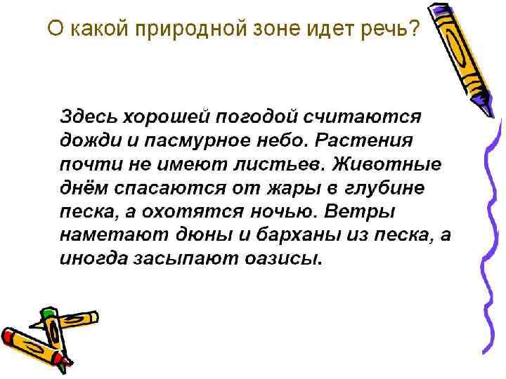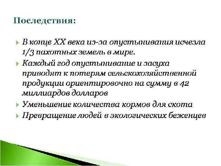 Засуха В зависимости от времени года различают весенние, летние и осенние засухи. весенние засухи особенно опасны для ранних зерновых культур; летние причиняют сильный вред как ранним, так и поздним зерновым и другим однолетним культурам, а также плодовым растениям; осенние опасны для всходов озимых. Наиболее губительны весенне-летние и летне-осенние засухи. Чаще всего засухи наблюдаются в степной зоне, реже в лесостепной: 2 -3 раза в столетие засухи бывают даже в лесной зоне. Понятие засухи неприменимо к районам с бездождным летом и крайне малым количеством осадков, где земледелие возможно только при искусственном орошении (например, пустыни Сахара, Гоби и другие). В целях повышения информированности мировой общественности ООН установила всемирный день борьбы с опустыниванием и засухой.