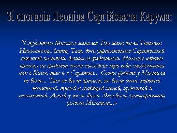"Студентом Михаил женился. Его жена была Татьяна Николаевна Лаппа, Тася, дочь управляющего Саратовской казенной палатой, девица со средствами. Михаил хорошо прожил на средства жены последние три года студенчества как в Киеве, так и в Саратове. . . Своих средств у Михаила не было. . . Тася не была красива, но была очень хорошей женщиной, тихой и любящей женой, худенькой и незаметной. Детей у их не было. Это было категорическое условие Михаила. . . »