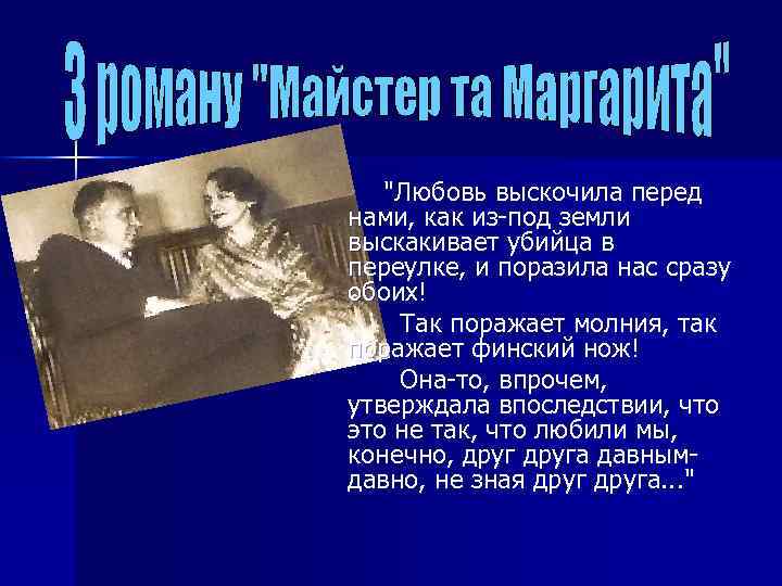"Любовь выскочила перед нами, как из-под земли выскакивает убийца в переулке, и поразила нас сразу обоих! Так поражает молния, так поражает финский нож! Она-то, впрочем, утверждала впоследствии, что это не так, что любили мы, конечно, друга давнымдавно, не зная друга. . . "