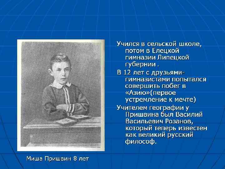 В 1893 -1897 Михаил Пришвин учился в Рижском политехническом институте, где увлекся идеями марксизма. В 1897 был арестован за участие в марксистских кружках, провел год в Митавской тюрьме, а затем выслан в двухгодичную ссылку в Елец. В 1900 -1902 учился на агрономическом отделении Лейпцигского университета, по окончании которого работал в Луге земским агрономом, опубликовал несколько статей и книг по специальности.